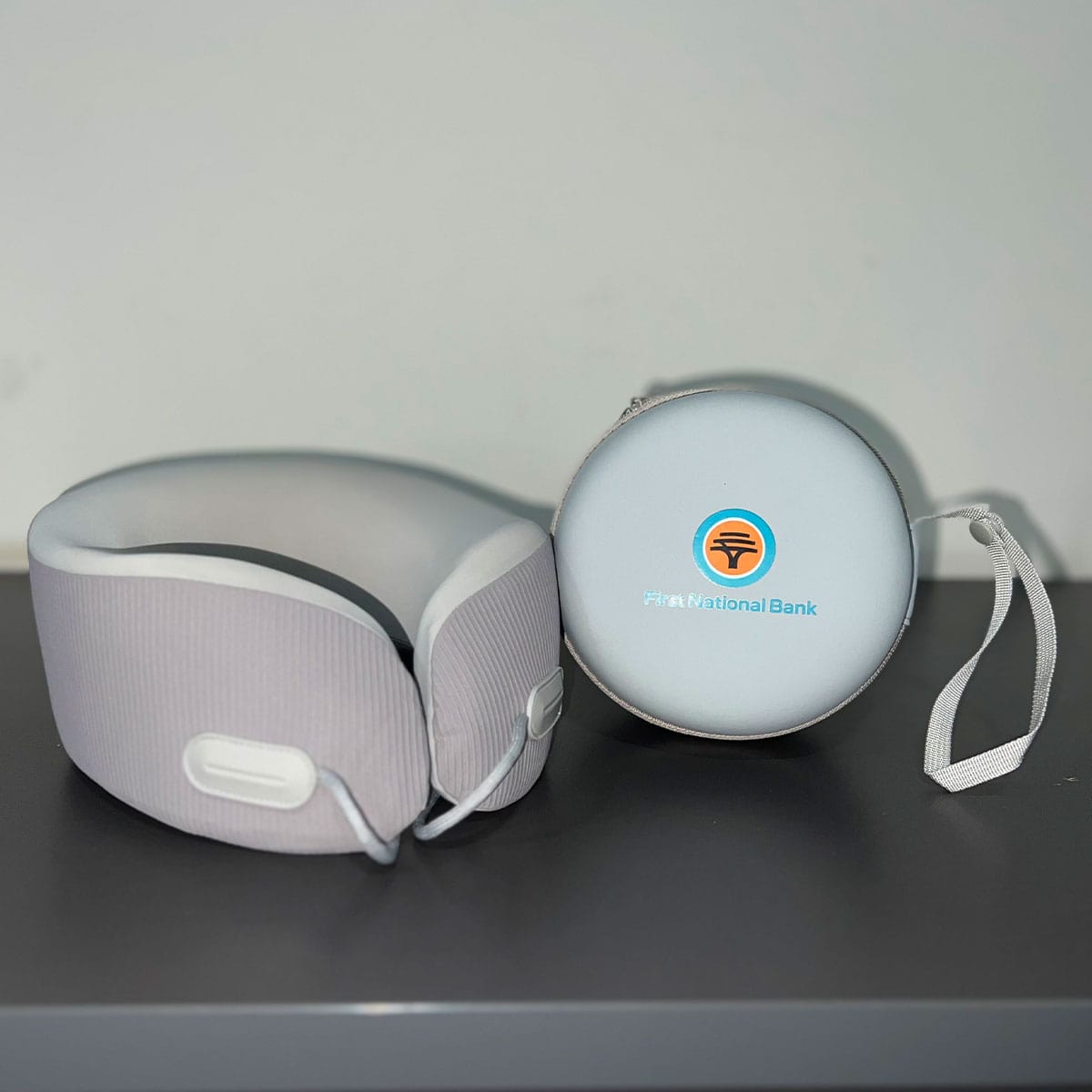 Experience restful travel wherever you go with the Turq Pop Travel Neck Pillow. Crafted from ultra-soft, breathable fabric and supportive memory foam, this pillow cradles your neck and head to relieve tension and prevent stiffness. The modern, compact design includes a matching case branded with First National Bank for easy portability.